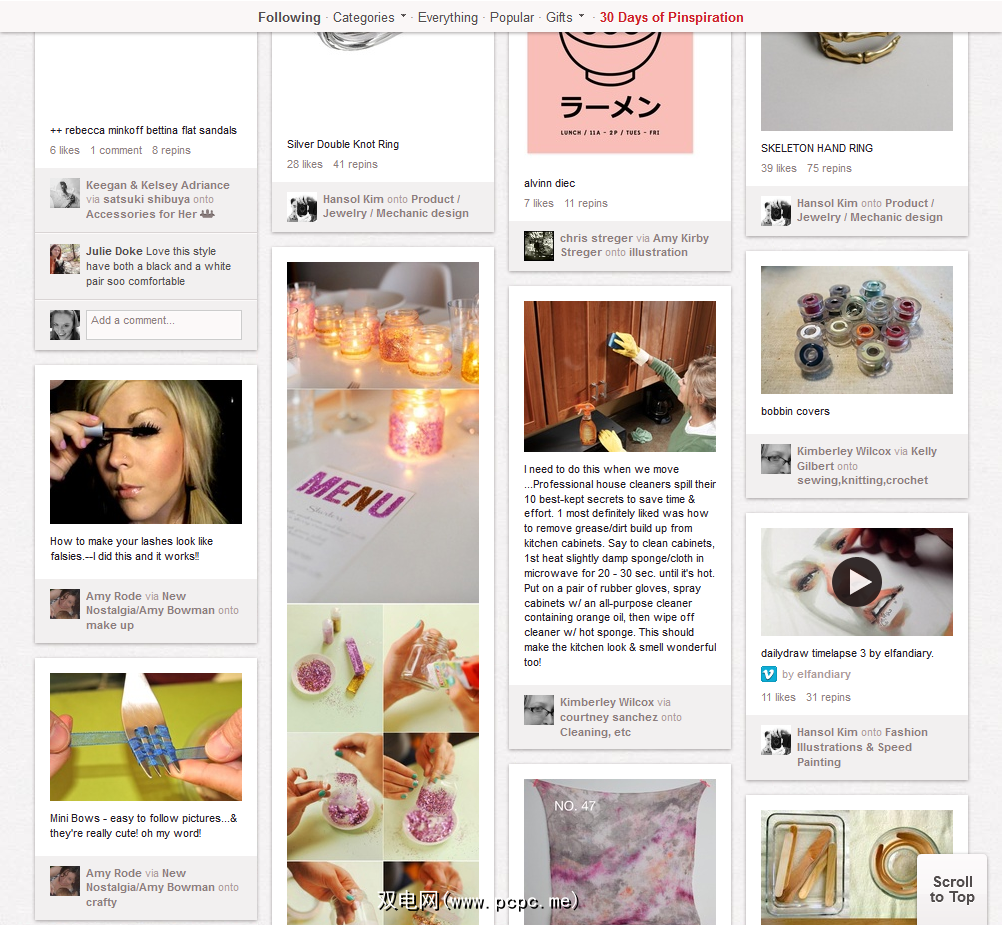 在Pinterest主页上滚动的一个小巧但非常不错的功能是,就像Energizer Bunny一样,它一直在运转……在前进……在前进。滚动时,页面上会加载更多的图钉,并且您可以继续从关注的人和董事会浏览精美的图钉。如果要跳回到首页的顶部,只需单击屏幕右下角显示的“滚动到顶部"标签。