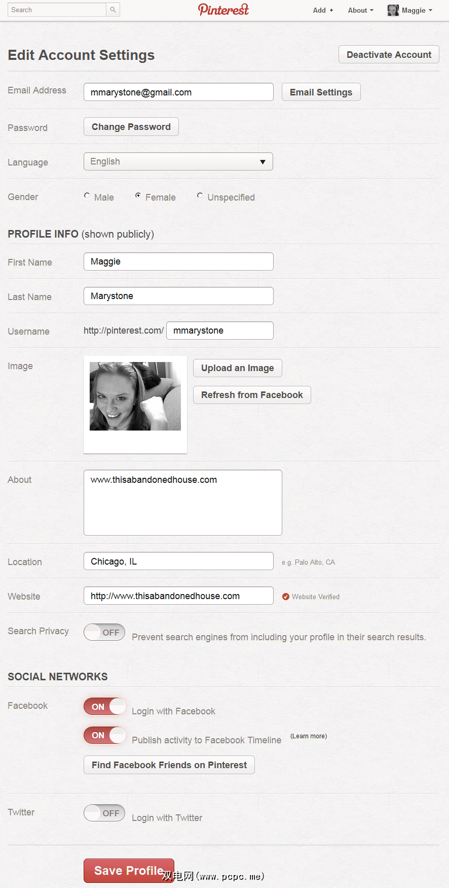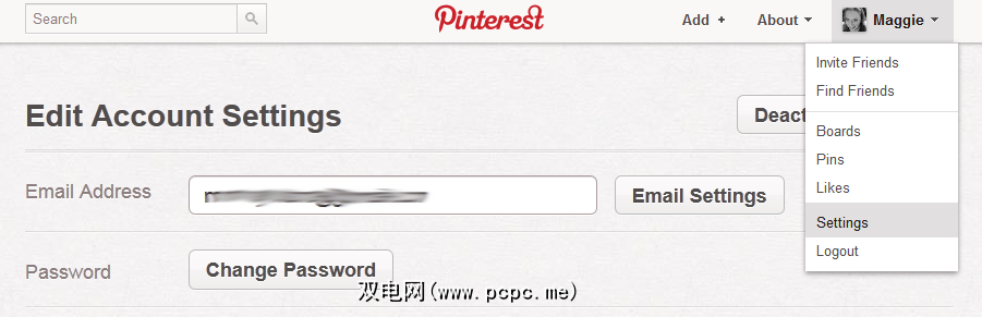 在“设置"屏幕中,您可以管理帐户设置和公开个人资料信息。您也可以在这里停用Pinterest帐户。将鼠标悬停在Pinterest工具栏功能区中名称旁边的下拉箭头上,然后单击“设置"链接,即可访问“设置"。