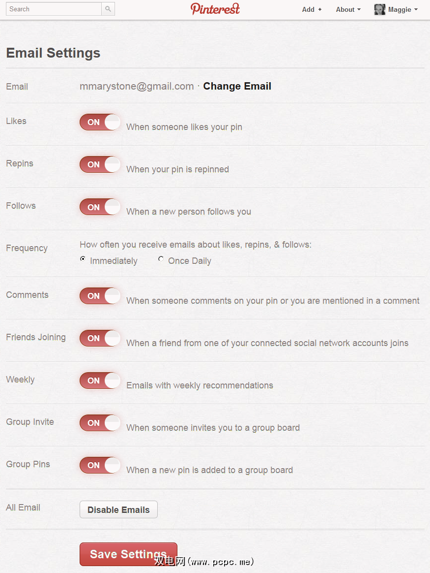 您可以完全控制Pinterest何时向您发送电子邮件。单击“设置"页面上的“电子邮件设置"按钮。在这里,您可以指定Pinterest是否(或多久一次)向您发送有关您Pinterest帐户活动的电子邮件通知。选择在以下情况下是否希望通过电子邮件通知您: