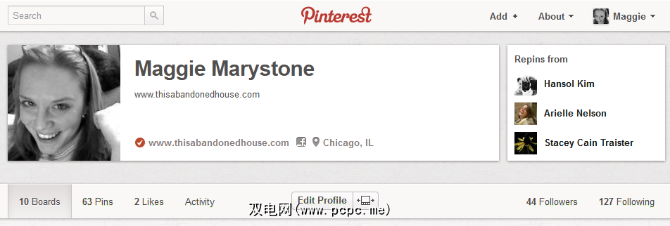 在Pinterest工具栏中(在首页和大多数其他Pinterest页面的顶部)单击您的姓名或照片,即可将您带到个人资料页面。您可以在此处查看和编辑自己的电路板和引脚。稍后,在第6章,您的Pinterest板中,我们将进行更多讨论。