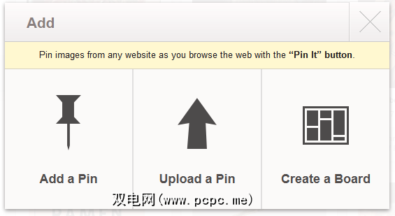 点击Pinterest.com上几乎任何页面右上角的“ Add +"链接。您将看到三个选项:添加图钉,上传图钉或创建板。