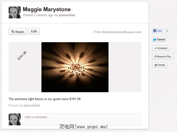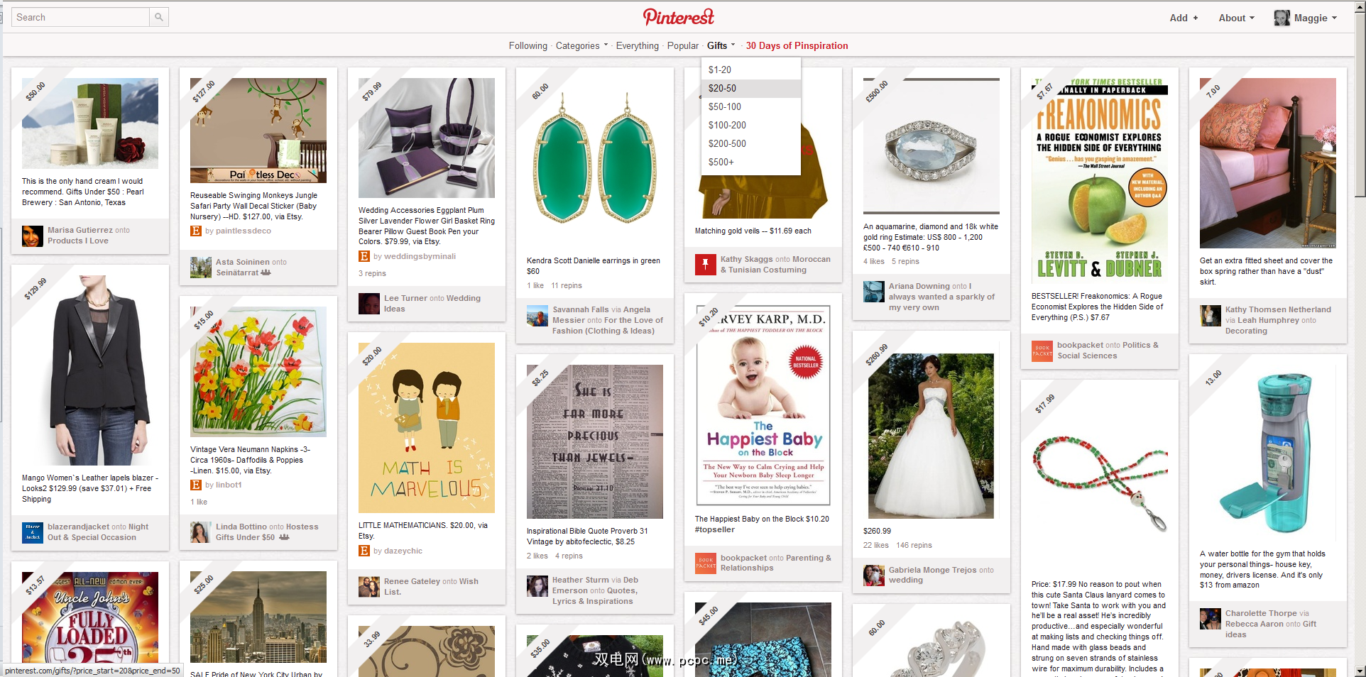 让我们尝试一下!访问您喜欢的任何包含至少一张图片的网站,然后单击您刚刚添加到浏览器书签栏中的“固定"按钮。单击“固定"按钮时,浏览器将在页面上显示所有图像的缩略图。单击您要固定的图像。出现一个弹出窗口,您可以在其中选择要将图像固定到哪个板上。您可以(并且应该)输入图像的描述。如果您要固定的图像属于待售产品,请在说明中包括价格。包含价格信息的图钉将在Pinterest.com的“礼物"部分中建立索引,您可以在其中浏览不同价格范围的礼物。