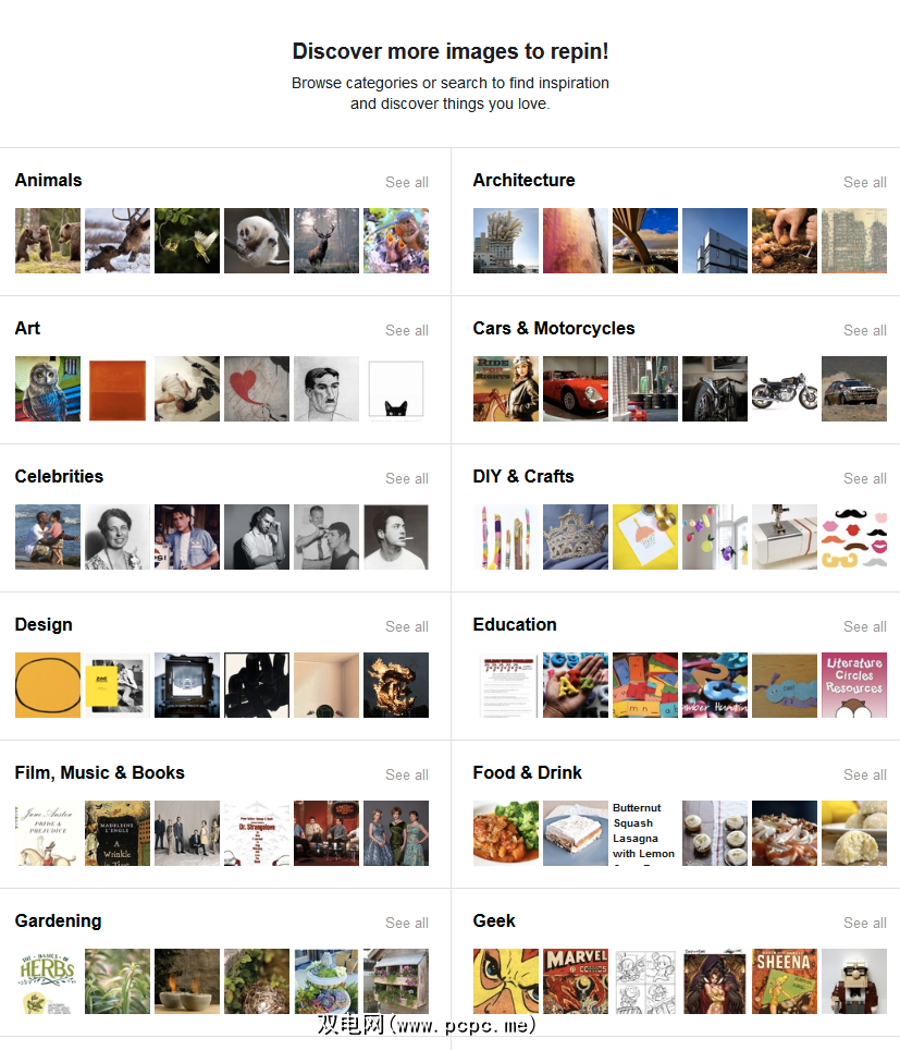 探索有关您最喜欢的兴趣的大头针! Pinterest上一次更新其类别列表是在2012年7月。随着越来越多的人加入Pinterest,希望该列表不断增长。目前,类别包括: