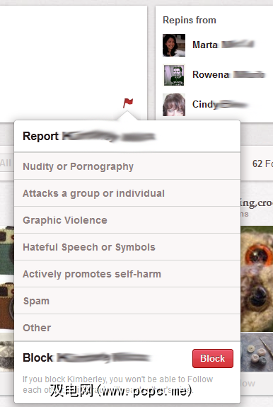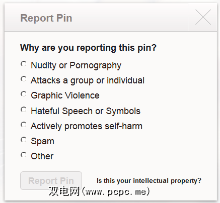 如果遇到别针,您觉得不合适,您可以点击图片右侧的“报告图钉"。您必须指定为什么要报告图钉。选项包括: