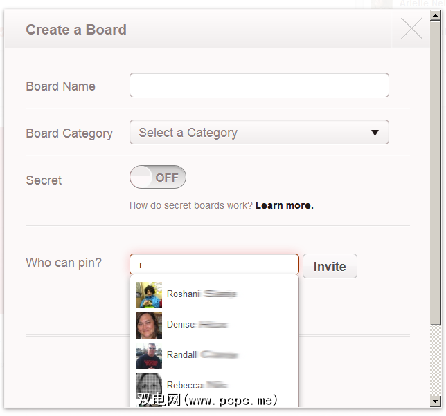 您还可以选择允许谁固定到新局上。邀请其他Pinterest用户固定在您的板上是一种很好的协作方式。