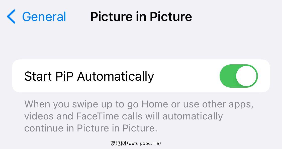 您还需要确保 PiP 已激活。您可以通过前往“设置” >“常规” > “画中画”并启用“自动启动画中画”来执行此操作。