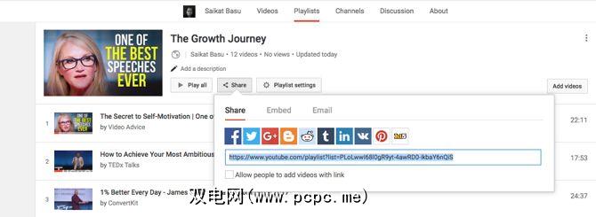 利用YouTube几乎隐藏的社交力量。您可以通过单击“共享"图标轻松共享公共的YouTube播放列表。但是,如果您想共享一个私人播放列表,则必须先邀请您的朋友或家人观看视频。