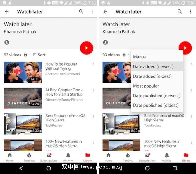 但是,关于“稍后观看"最令人沮丧的事情功能是其默认的排序方法。当您转到库>稍后观看时,您会发现播放列表是按时间顺序排序的。要查找最新视频,您必须滚动到列表底部。那是多么古朴!值得庆幸的是,您现在可以翻转它。在稍后观看部分中,点击排序按钮,然后切换到添加日期(最新)。